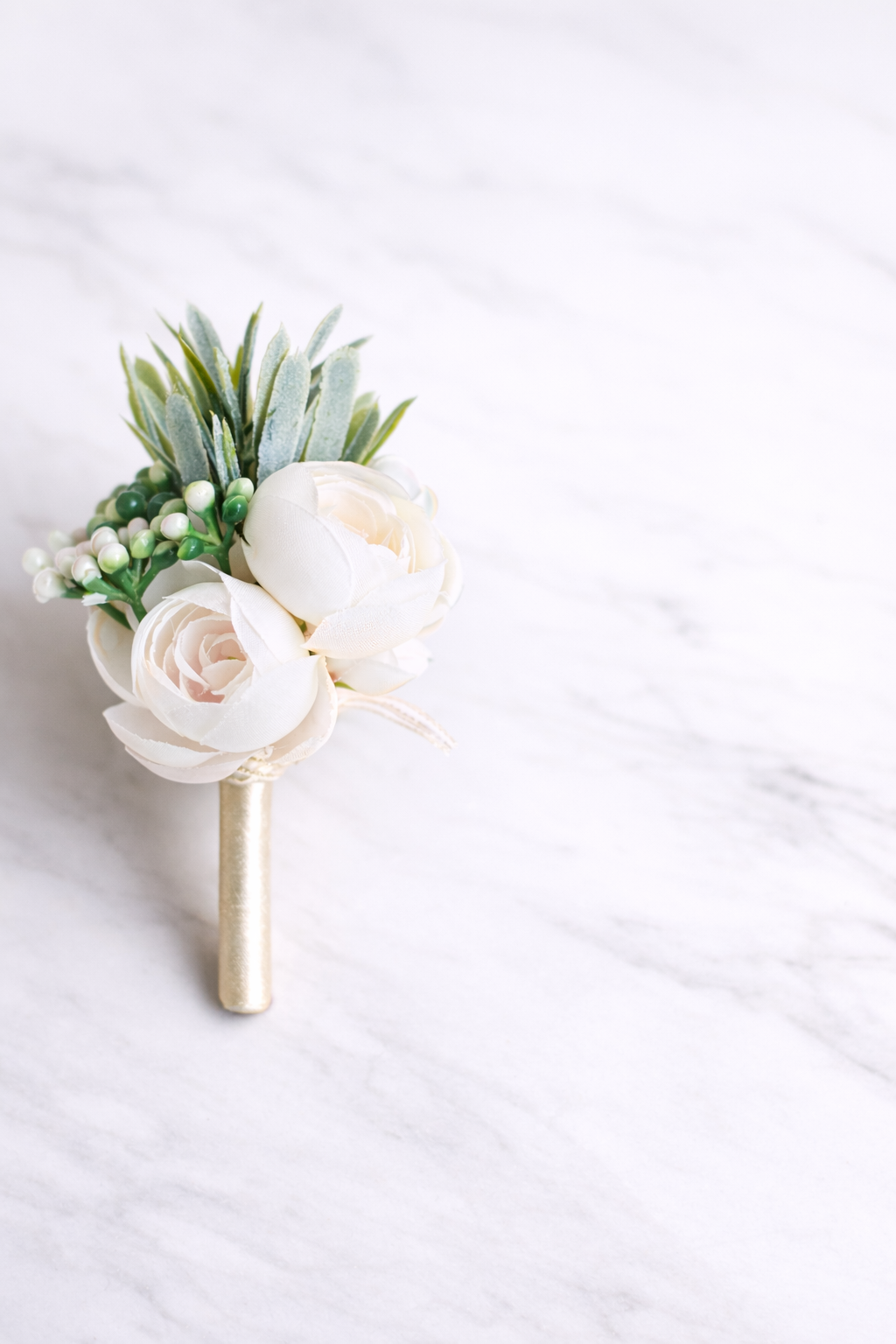 Botonier de ramo blanco, diseñado para aportar un toque de elegancia y distinción a trajes formales. Ideal para matrimonios, ceremonias y eventos especiales, este accesorio realza el look del novio o acompañante con un estilo sobrio y atemporal.